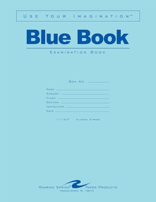 Roaring Spring Paper Products blue exam book has smooth 15 lb. white paper. Each book is 8.5"x 11" and contains 4 sheets/8 pages of writing paper. Wide ruled blue horizontal lines with a red margin. Covers are 50 lb. offset. 2 staples along the 11" spine hold the book together. 500 Books to a case. Made in the USA!