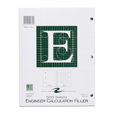 The Roaring Spring Paper Products engineer paper is excellent for engineering classes and labs, and professional use. Smooth, green tint 15 lb. writing paper is plain, except for the printed outline box on the top of the sheet, and has a 5" x 5" grid layout printed on the back of the sheet. The back grid shows through to front as dimensional guide for drawings and layouts. Three-hole punched to fit in standard three-ring binders. Sheet size is 8.5" x 11". 500 sheets per pack. Each pack is poly-wrapped. Proudly made in the USA.