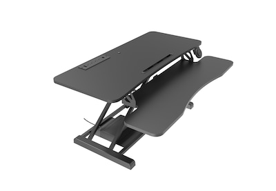 The R EDRB electric stand up desk converter provides effortless functionality in a standing desk converter, with smooth quiet up/down motion at the touch of a button. Features a large 37.4" x 15.75" work surface, plus a full size 31.8" x 11.8" fixed keyboard tray that holds a keyboard or laptop. Electric lift system raises up to 33 lbs, with EVR Enhanced Vertical Range from 4.7" to 19.7" allowing comfortable ergonomics for users of all heights. Useful extras include 4 AC outlets + 2 USB 2.0 ports on the desktop, a 10.5" wide slot on the main work surface to hold a tablet or phone, and a rear grommet hole for an optional monitor arm. It's black laminated finish will complement any color scheme.