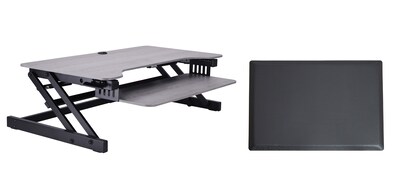 The R DADRG-MAFM standing desk converter combo now optimizes your ergonomic work position with Enhanced Vertical Range, which seamlessly raises your tabletop up to 17" and lowers it down to 5". The large 37.5" x 20.5" desktop can hold up to two screens along with other small accessories. Its full size 29" x 11.5" retractable keyboard tray holds a laptop or keyboard as well as a mouse. This sturdy adjustable workstation arrives fully assembled with nonskid pads to protect your desk from scratches. The gray wood grain laminated finish will complement any color scheme. The added R MAFM Anti-Fatigue Mat will reduce the effective weight on your back, hips, knees and feet so you can get all the benefits of standing while you work. The advanced multi-layer construction offers a comfortable “leather like" top surface, a memory foam inner layer and a non-slip bottom. Beveled edges help to reduce tripping issues and 3/4" commercial grade thickness provides hours of comfort and stability.