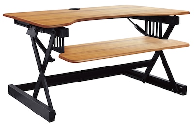 The R DADRT-40 standing desk converter now optimizes your ergonomic work position with Enhanced Vertical Range, which seamlessly raises your tabletop up to 20" and lowers it down to 5". The large 40" x 23.5" desktop can hold up to two screens along with other small accessories. Its full size 25.5" x 11.25" retractable keyboard tray holds a laptop or keyboard as well as a mouse. It's convenient grommet hole provides a hassle free cable management system or can be used to install a monitor mount (R DM2) to maximize desk space efficiency. This sturdy adjustable workstation arrives fully assembled with nonskid pads to protect your desk from scratches. The teak wood grain laminated finish will complement any color scheme.