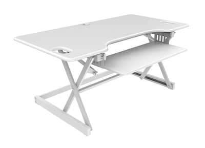 The R DADRW-46 standing desk converter now optimizes your ergonomic work position with Enhanced Vertical Range, which seamlessly raises your tabletop up to 20" and lowers it down to 5". The large 45.75" x 23.25" desktop can hold two to three screens along with other small accessories. Its full size 25.75" x 11.25" retractable keyboard tray holds a laptop or keyboard as well as a mouse. It's convenient grommet hole provides a hassle free cable management system or can be used to install a monitor mount (R DM2 or R DM3) to maximize desk space efficiency. This sturdy adjustable workstation arrives fully assembled with nonskid pads to protect your desk from scratches. The white laminated finish will complement any color scheme.