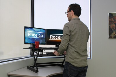 Sit or stand up with the Rocelco 46" Height Adjustable Dual Monitor Corner Standing Desk Riser.