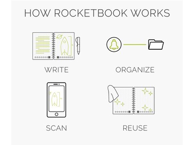 Write notes, scan the page with the free Rocketbook App for iOS and Android, then erase with a damp cloth and reuse The Rocketbook Core executive notebook provides a classic pen and paper experience, yet is built for the digital age. While feeling like a traditional notebook, the Rocketbook Core is very reusable and can connect to all of your favorite cloud services. When you write using any pen from the Pilot Frixion line, your writing sticks to the notebook's pages as if it was regular paper. But add a drop of water, and the writing erases like magic.