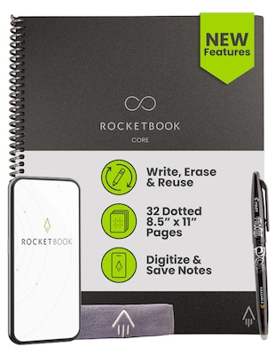 - Includes 1 Rocketbook Core Letter Size (8.5" x 11") Notebook, 1 Pilot Frixion Pen, and 1 Microfiber Cloth