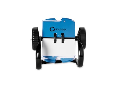 Organize contact information with this mini rotary card file. The compact footprint takes up minimal space on a desk or phone stand, and the handy cards snap in and out for easy access. A rotary mechanism lets you flip through contacts quickly until you find the one you need. This Rolodex mini rotary card file features a tubular metal frame for added strength and resilience.