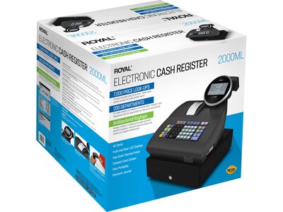 Ensure purchases run smoothly with this black cash register. This Royal Alpha2000ML black cash register comes with 10-line alphanumeric LCD front and one-line LED rear displays and a convenient built-in alphanumeric printer, producing receipts for customers as soon as the transaction has processed. Made of recycled plastics. The locking cash drawer features four-slot bill and five-slot coin trays.