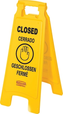 - Rubbermaid two-sided yellow floor sign with multi-lingual "Closed" imprint