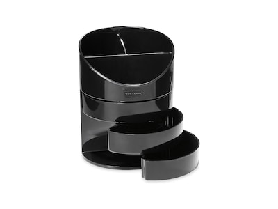 Grab a marker, a pen, or another writing utensil quickly with this storage pen cup. With two deep main sections, this holder cup allows for convenient containment of scissors, rulers, and other long supplies, while the multiple swing-out compartments keep paperclips, erasers, and other small accessories tucked away. This Rubbermaid storage pencil cup is constructed from plastic material for enhanced durability.