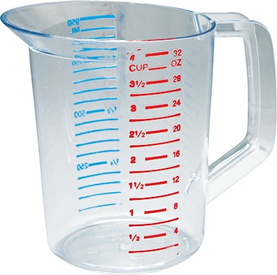 Rubbermaid Bouncer Measuring cup in clear color of 32 oz capacity is ideal for fast, easy identification of contents.