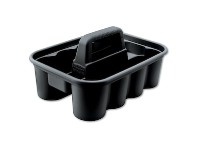 Bring eight tools or bottles easily through lobbies, convention centers, offices and other large buildings in this supply caddy, which fits snugly onto most commercial cleaning carts. This caddy features rounded compartments to keep 32-ounce bottles of cleaning and polishing agents upright and stable. Use the comfortable, ergonomically designed handle to carry this Rubbermaid deluxe cleaning caddy between buildings or up stairs for greater flexibility in large facilities.
