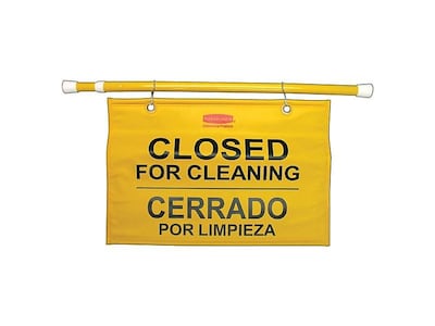 Restrict access while your janitorial crew is working with this Rubbermaid Commercial hanging safety sign. The bright yellow color and multilingual message alert passersby to stay away, and the expandable pole fits securely in doorways to keep the sign visible. This Rubbermaid Commercial hanging safety sign features a soft design, making it easy to fold and store in between uses.