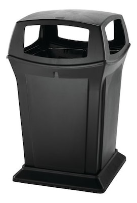 Collect and contain up to 45 gallons of trash in this square fire-safe container. Made from sturdy structural foam, it withstands daily use in harsh outdoor conditions, and the permanently attached lid with side openings allows effortless emptying. Metal retainers on this black Rubbermaid Ranger container offer secure, discreet liner placement.