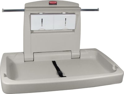 Create a family-friendly environment in your restrooms with this Rubbermaid horizontal baby changing station. Designed to give parents a comfortable place to change their baby's diaper while they are away from home, this changing station has a clean, streamlined appearance and a light platinum color that matches most bathroom design schemes. The wall-mounted design helps you save space in a small restroom while allowing you to place it at a height that is convenient and comfortable for your staff and customers.