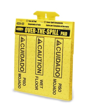 Rubbermaid "Over-the-Spill" pads cover spills to alert walkers of the presence of a wet hazard. Their bright yellow color is highly noticeable, and the easily understood text and symbols provide a clear warning of the nature of the problem. Manufactured from melt-blown polypropylene, these pads are slip-resistant to prevent injury from slipping and falling in case a pedestrian still happens to walk over them. Perforated to make tearing single pads off the dispenser easy, these spill covers are quick to deploy.