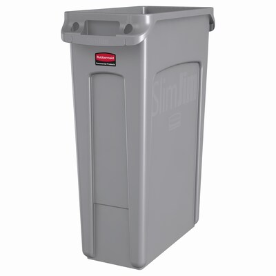 Rubbermaid Slim Jim gray 23-gallon vented rectangular waste receptacles optimize waste handling at your office building, factory floor or casual establishment. Venting channels reduce the force needed to lift each trash bin to enhance the safety of your staff. Molded-in holes and cinch points remove the need to tie-down trash can liners to save on staff time and effort. A standard size works with a wide variety of liners to suit your needs, whether you require puncture-resistant liners or standard ones.