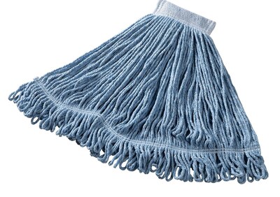 Wipe floors clean of dirt, stains, and grime with this 5-inch blue mop headband. It's made of cotton and synthetic yarn for maximum absorbency and strength, and the durable construction withstands up to 50 commercial wash cycles. This Rubbermaid mop head has a looped end design to reduce tangling and unraveling.