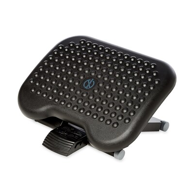 The Rubbermaid height-adjustable tilting footrest provides height and angle adjustments for a fully personalized comfort level. Massage bumps put gentle pressure on the bottom of the foot to relieve pain and improve leg circulation. This footrest is constructed of durable plastic to hold lower body weight easily and ensure a long-lasting product. Featuring a nonskid surface, this footrest stays put on your feet for an extended period of time, which makes it a great choice for long days on the computer.