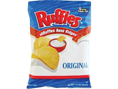Stock your home, office lunchroom, and waiting areas with these original potato chips. At 64 servings in a box, this bulk order is perfect for large groups. These 1.5-ounce-size servings of Ruffles potato chips are a perfect fit in your backpack or purse for a convenient snack on the go.