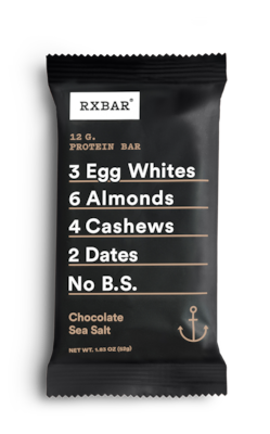 RxBars are whole food protein bars made with egg whites, dates, nuts and natural ingredients like 100% cacao or blueberries to provide added taste and texture.
