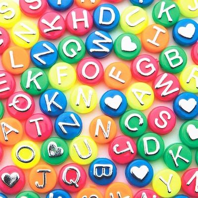 Neon alpha beads bag contains a full set of alphabet beads, some hearts features 10mm bead with a 2mm hole, silver raised letters and sold as 600 beads per 1/2 lbs. bag.