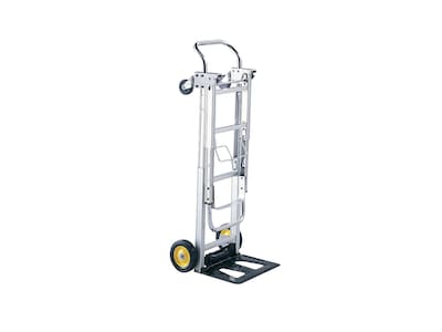 Make moving heavy loads easy with this Safco Hide-Away convertible hand truck. The flexible design lets you extend the hand truck or easily hide it away, and foldable design means you can keep it close at hand and ready for immediate use. Weighing in at 21 pounds, the hand truck features an aluminum frame and steel handles that extend for use and retract for storage, and the aluminum platform can lengthen more than 50 percent to adapt to varying load sizes. Two solid rubber wheels and two solid rubber casters give this Safco Hide-Away convertible hand truck a 250-pound capacity as a two-wheel conveyance and a 400-pound capacity as a platform.