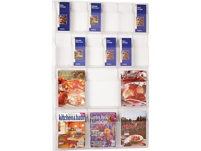 Give visitors to your office, hotel or medical practice easy access to brochures, booklets and promotional materials with this Safco Reveal 12-pamphlet and six-magazine display. The clear construction creates a clean, streamlined appearance. This Safco Reveal 12-pamphlet and 6-magazine display comes with wall-mounting hardware for easy installation.