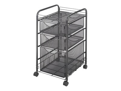 Create a filing system with this Safco black mesh file cart. Three drawers provide ample room for a variety of files and stacks of paperwork, helping you organize your desk space. Lockable casters keep the cart in place when needed, while casters on the base allow for easy mobility. This Safco Onyx mesh file cart is perfect for the office or home filing system.