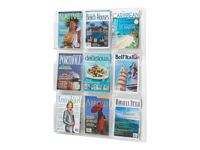Keep booklets, brochures, and other literature off tables and neatly store them away in this magazine display. Nine pockets make it easy to arrange items by subject or type, while the clear construction ensures titles remain visible. This Safco Reveal magazine display comes with wall-mounting hardware for quick, simple setup.