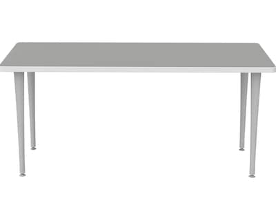 - Table with a fixed silver-tone metal base and 1" high-pressure laminate top in a fashion gray finish with T-mold white edge band