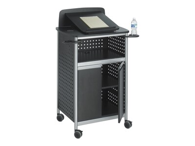 Make preparing for multiple presentations simple with this Safco Scoot multipurpose lectern. The storage cupboard with doors and an adjustable shelf holds your laptop and projector safely, and the two swivel cup holders accommodate your water and coffee or tea during your talk. This Safco Scoot multipurpose lectern is constructed of sturdy powder-coated steel for durability and moves from room to room effortlessly on the four casters, two of which lock for secure placement.