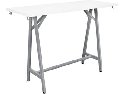 Great for individual work or impromptu team meetings, the Safco Spark teaming table features a small footprint that allows for social and teaming areas without the need for a lot of space. The durability of the high-pressure laminate work surface combined with the steel A-frame style base with built-in footrest allows the Spark to fit virtually anywhere, providing flexibility and control of adapting workspaces. Built-in hooks under the tabletop provide convenient storage for personal items. The footrest provides support while standing that encourages shifting positions for increased movement.