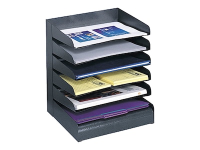 Organize important paperwork with this six-compartment tray sorter. This black desk tray sorter comes with rubber feet to protect your desk's surface from scratches. The sturdy steel construction guarantees a long-lasting tray sorter, while the fingerprint-resistant design ensures that the tray always looks clean. This Safco desk tray sorter comes with slanted shelves, so putting documents in and removing them is simple.
