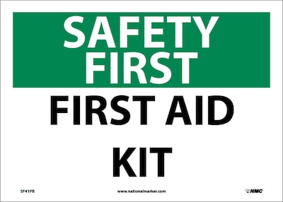 National Marker "Safety First Aid Kit" Safety sign measuring 10" x 14" is made of adhesive vinyl material for durability.