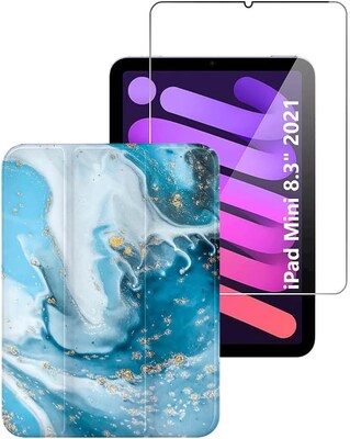 SaharaCase Apple iPad mini (A17 Pro) and Apple iPad mini (6th Generation 2021) Protection Bundle, Folio Case with Tempered Glass Screen, Blue Marble