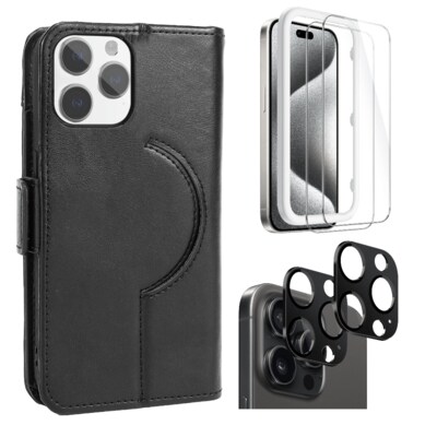 Protection Kit Bundle - Genuine Leather Wallet Case with Tempered Glass Screen and Camera Protector for iPhone 15 Pro Max - Black