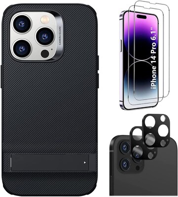SaharaCase iPhone 14 Pro 6.1" Bundle, AirShield Boost Kickstand Case with Tempered Glass Screen and Camera Protector, Black