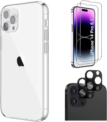 SaharaCase iPhone 14 Pro 6.1" Bundle, Hybrid-Flex Hard Shell Case with Tempered Glass Screen and Camera Protector, Clear
