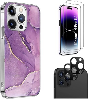 SaharaCase iPhone 14 Pro 6.1" Bundle, Series Case with Tempered Glass Screen and Camera Protector, Purple Marble