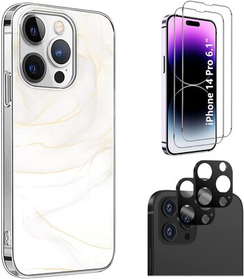 SaharaCase iPhone 14 Pro 6.1" Bundle, Series Case with Tempered Glass Screen and Camera Protector, White Marble