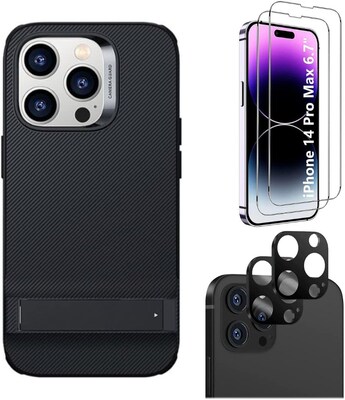 SaharaCase iPhone 14 Pro Max 6.7" Bundle, AirShield Kickstand Case with Tempered Glass Screen and Camera Protector, Black