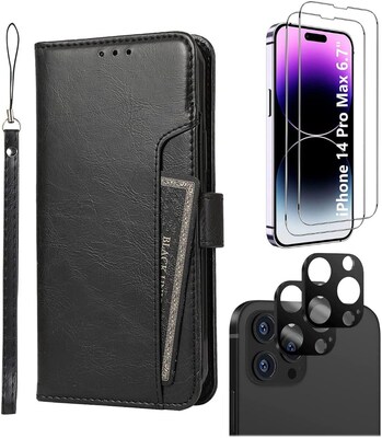 SaharaCase iPhone 14 Pro Max Bundle, Leather Folio Wallet Case with Tempered Glass Screen and Camera Protector, Black