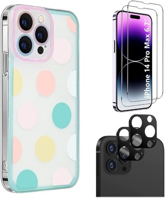 SaharaCase iPhone 14 Pro Max Bundle: Polkadot Hybrid-Flex Hard Shell Case, Tempered Glass Screen + Camera Protector, Multicolor