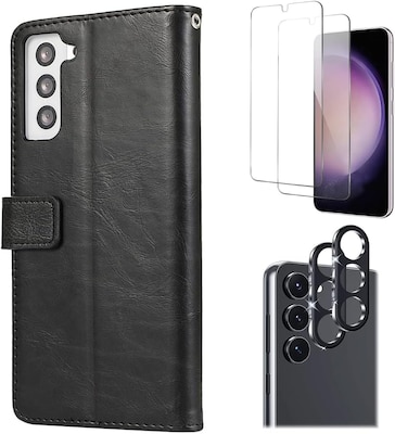 SaharaCase Samsung Galaxy S23 Protection Bundle, Folio Wallet Case with Tempered Glass Screen and Camera Protector, Black