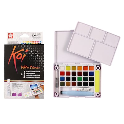 Koi Water Colors are fun and vivid watercolor paints to illustrate, decorate and create art with! This compact kit contains 24 vibrant watercolors and includes a removeable mixing palette, a sponge and a Koi Water Brush (brush with water tank). The set also comes with a 5 ml tube of iridescent medium. The pearlescent particles of this medium add a stunning shiny effect to your work. Easily create striking and unique works of art by adding this medium to your watercolors. Koi's rich color assortment offers the choice to create bold hues or soft and subtle shades. Keep this small set close by in your studio for a quick splash of color and to create deep washes for backgrounds. Or bring it along to create portraits and plein-air landscapes in the outdoors. This pocket-sized box is also great for adding color to comics, illustrations, and lettering projects.