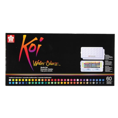 Koi Water Colors are fun and vivid watercolor paints to illustrate, decorate and create art with! This compact kit contains 60 vibrant watercolors and includes a mixing palette in the lid of the box, a sponge and a Koi Water Brush (brush with water tank). Koi's rich color assortment offers the choice to create bold hues or soft and subtle shades. Keep this small set close by in your studio for a quick splash of color and to create deep washes for backgrounds. Or bring it along to create portraits and plein-air landscapes in the outdoors. This pocket-sized box is also great for adding color to comics, illustrations, and lettering projects.