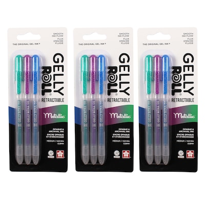 These creamy, colorful Gelly Roll® gel ink pens will be your favorite flavor for letting thoughts flow onto paper. Our shiny gel ink writes on matte or glossy papers, and comes in an 08 medium tip size for smooth gel ink flow. Our Archival Ink stays put! Gelly Roll Retractable is waterproof, chemical & fade resistant, bleed-free, and ph-neutral. Each set includes 3 medium tip pens in assorted colors. Sold as 3 sets for a total of 9 pens.
