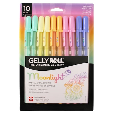 The Ice Cream Smooth™, opaque ink is perfect for writing in journals, decorating cards, pattern drawing, or detailed accents. Bold 10 nib is ideal for coloring and creating paint-like effects. All colors are bright on white paper and produce outstanding effects on quality black paper. Non-fluorescent pen ink is waterproof and fade resistant when dry; fluorescent ink glows under blacklight. Each pack includes 10 pens. Sold as 2 sets for a total of 20 pens. Note: Moonlight ink comes in two types: archival and fluorescent. Archival Gelly Roll Moonlight colors contain pigment-based ink – chemically stable, waterproof, and fade resistant. Fluorescent Gelly Roll Moonlight colors can fade if exposed to direct sunlight and glow under a black light.
