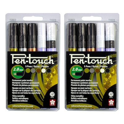 Pen-Touch writes on a wide variety of surfaces including cardstock, plastic, wood, glass, porcelain, paper and metal. The archival quality paint is chemically stable, waterproof, and fade resistant. The marker is also suitable for various industrial purposes, including manufacturing, quality control, security and theft prevention and construction. The marker features an aluminum barrel and a valve-action mechanism to ensure good flow of the highly pigmented ink. Writes on various surfaces, including steel & iron, sheet metal, glass & plexiglass, wood, ceramics, porcelain and plastics. Ideal for several industrial uses, including marking and identifying parts, pipes & tubing, sheet metal, wiring, construction assembly, manufacturing & fabrication processes. Adheres permanently to most surfaces. Removable from non-porous surfaces with alcohol or lacquer thinner. Each set includes 5 pens: Gold, Silver, White, Copper and Black. Sold as 2 sets for a total of 10 pens. Specifications: Nib: fiber Working temp.: 5°C - 40°C Ink type: Pigment solvent-based ink Size: 141 mm