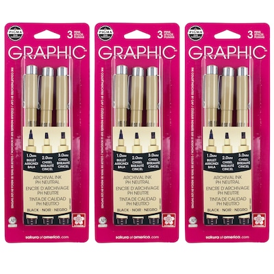When artists want dark, bold pen strokes that last, they turn to Pigma® Graphic™ and archival Pigma® ink. The three large pen nibs are designed to meet the specific needs of illustrators, cartoonists, and manga artists by enabling a broad range of illustration techniques. The 1mm bullet nib is ideal for shading, texturing or filling in large areas. The 2mm and 3mm level chisel nibs can make both thin and thick lines to achieve stylized strokes and creative lettering. Pigma ink has become the standard for what is defined as reliable, permanent, archival quality ink. Each pack includes pens: bullet (1mm tip), chisel (2mm tip), and chisel (3mm tip). Sold as 3 packs for a total of 9 pens.